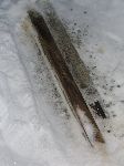 Detail kolejnice. Dřevěný trámek pobitý železným pásem.