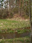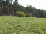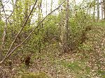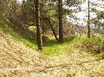 Pokračování zasypaného příkopu (jiná barva trávy) kolejky vedoucí do křoví