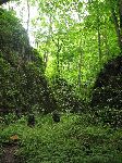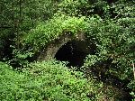 Vydlážděné svahy trati k Tisovci. Pod těmito náspy jsme pod námi v protější stráni zahlédli jakousi zeď. Pevně jsme věřili, že ústí tunelu je stále před námi, protože od ústí Martinovej doliny stále stoupáme po znatelném širokém zářezu trati ve svahu. Po pozdějším zhodnocení ta zeď byla předústí k portálu tunelu. Ale po čem jsme to tedy tady celou dobu šli? Možná to byla jen dopravní cesta ke stavbě zpěvnění svahu.