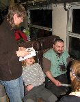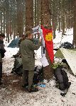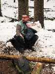Odpočinek kolem šestej ráno... se čtyřiceti kilovým báglem /palma, rozcestníky, žákovský, vysvědčení, nářadí, pytlíky se šiframa na tři kontroly a dalších asi padesát nutných drobností/ se nedá normálně chodit. Ale hlavně jsem se bál, aby to vydržely švy baťohu, páč v nich solidně praskalo. Na síle mi nepřidala ani probdělá noc v Hradci Královým, protože v Práglu tradičně na sebe vlaky nečekaly a čtvrteční večer už jsem se do Dvora Královýho nedostal. A s tímto šutrem na zádech hledat spaní někde za HK nádražím... no, nonstop to jistil.