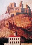 Ofocený detail z infocedule s domnělou podobou hradu Žampach a hrádku Chudoba