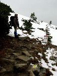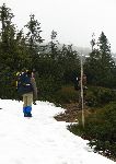 V závěrečném stoupání na hoře Pilská. Orientace v mlze a větrném dešti může být i zajímavá.