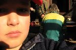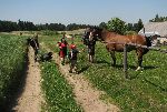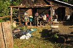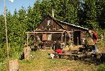 Ráno u sroubku Katovna s místními osadníky chystajícími se na opravu střechy. Tož musíme rychle pryč, aby jsme nedostali nějakou práci.