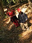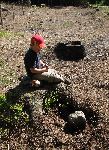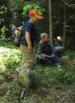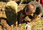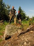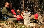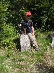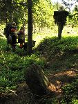 Našli jsme další mezník, kterému byla vidět jen hlavička. Povysadit ho výše by bylo skrz pařez na dlouhou dobu, tak ho Váňa s Matesem aspoň odkryli.