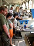 Při výkladu malování na sklo. Žlutá budka v pozadí slouží pro pískování skla.