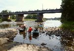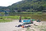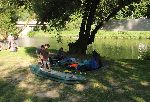 Ráno ve fajným kempu Mezi mosty nafukujeme lodě. Pro objednanou loď se bude muset na druhou stranu přebrodit.