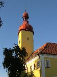 Věž zámku Stráž nad Nežárkou. Zámek byl v počátku 18. století přestavěn ze staršího hradu pány ze Šternberka. Strážní hrad, který zámku předcházel pochází z druhé poloviny 13. století a jehož staviteli byl rod Vítkovců. Na hrad nejvíce upomíná věž, bergrift s výrazným břitem.