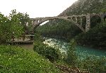 Železniční most Solkan Bridge přes Soču. S délkou oblouku 85 metrů je nejdelším vlakovým kamenným mostem postaveným z kamenných bloků.