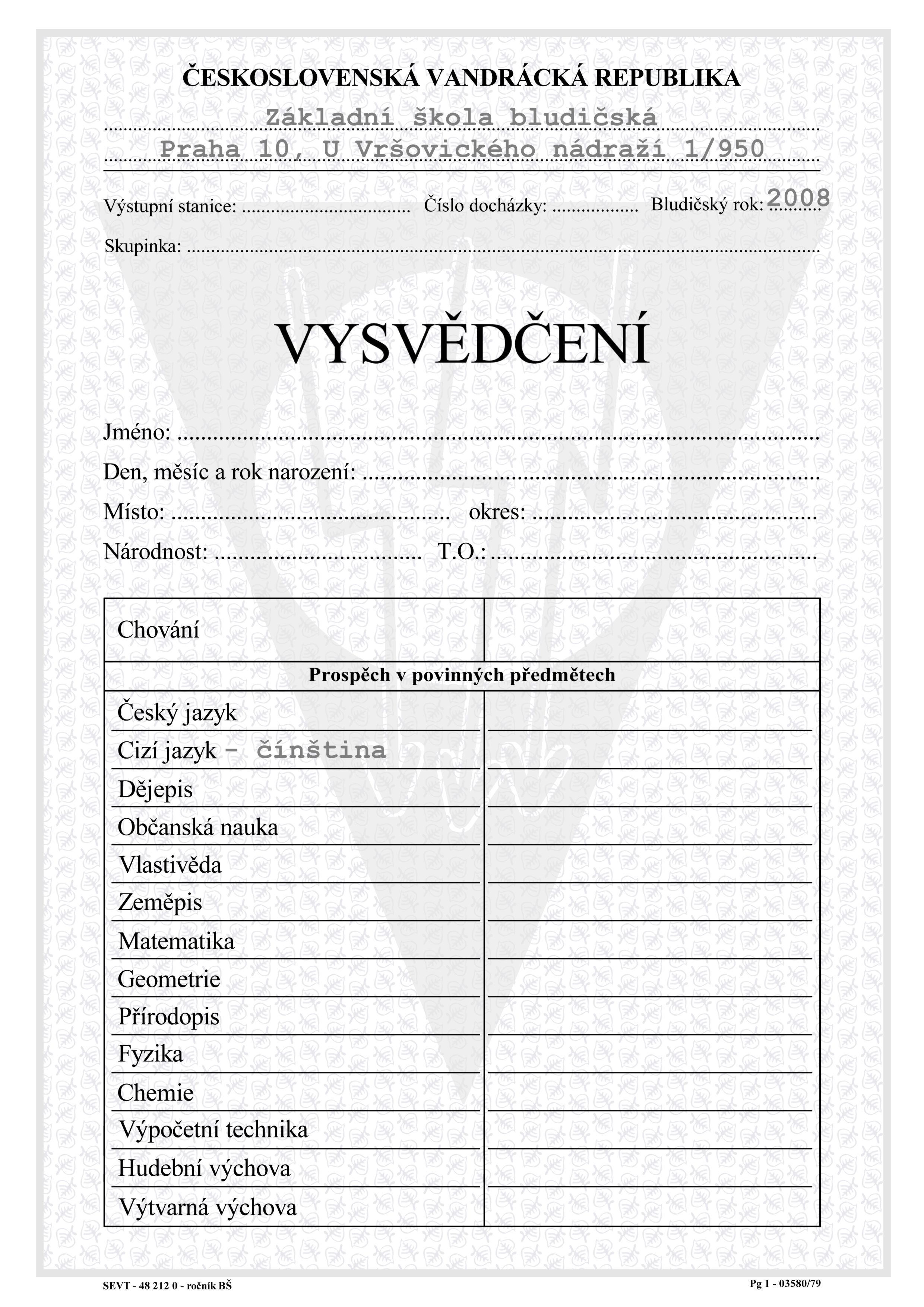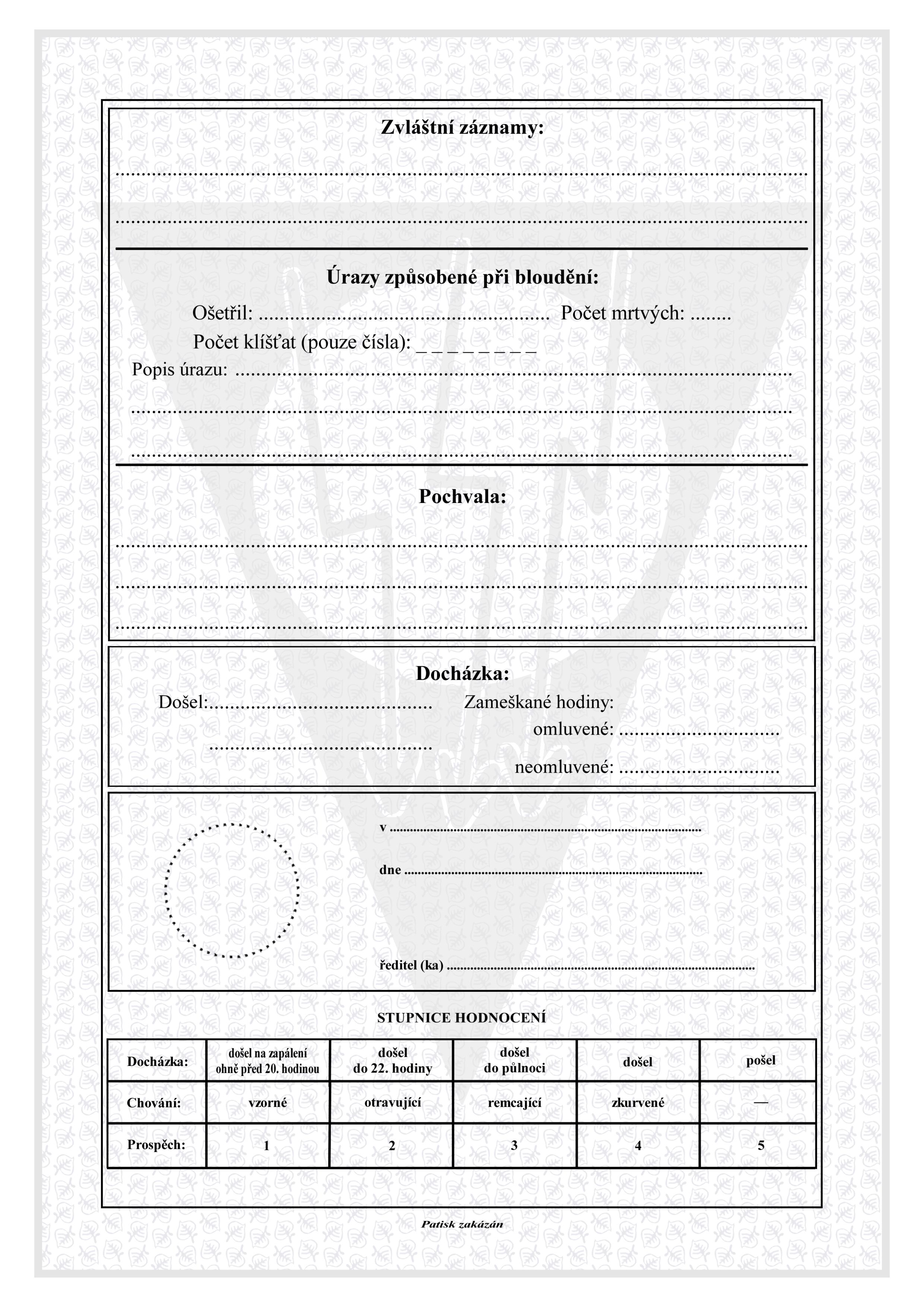 | Nějaká odměna, camrátko pro došlé bludiče být musí. A co jiného se ve škole dává za "odměnu" na konci roku? Nebylo tedy o čem přemýšlet. Původně jsem myslel, že seženu originál vysvědčení a pokud možno ještě originál socialistický, ale hnedle jsem narazil, protože lejstra vysvědčení jsou chráněné papíry, každé má prej své číslo, a tak. Nezbývalo mi než sednout za čítač, nastartovat CorelDraw, Corel PhotoPaint, skenr a začít bastlit. Tedy v první řadě jsem musel doma vyhrabat a naskenovat nějaký originál vysvědčení, abych se měl od čeho odpíchnout.V prvotním záměru jsem chtěl bitmapu vysvědčení jen přeretušovat, ale výsledek vůči pracnosti po prvních pokusech nebyl pravý ořechový a udělat úplně nové vysvědčení se mi začalo jevit jako rozumnější už jen z důvodu předělávek (nápad vysvědčení i jeho vytvoření byl mezi prvníma věcma, které vzniklo k Bloudění), různých změn, které v průběhu vymýšlení Bloudění určitě nastanou.Podle originálního vysvědčení jsem ve vektorech vytvořil lupínky vodoznaku a místo lva jsem vytvořil znak TODČ. Celkový vodoznak, pozadí vysvědčení vypadal dobře. Texty, rámečky vysvědčení jsem musel upravit podle našich potřeb, ale jejich rozvržení jsem se snažil dodržet podle originálu, aby vysvědčení neutrpělo na celkovém vzhledu. A v neposlední řadě odzkoušet jak si s vodoznakem poradí tiskárna. Výsledek byl lepší než jsem čekal!K závěru, tedy těsně před samotným Blouděním jsem vysvědčení doupravil podle aktuálních změn a prohnal přes tiskárnu. Zbývalo domyslet nějaký systém známek. Nápadů bylo několik, udělat doplňující otázky u každého předmětu a ty pak vybrat a oznámkovat nebo udělat závěrečný test, zkoušku třeba i jako poslední kontrolu s jednoduchýma, vtipnýma otázkama a ty pak ohodnotit po vzoru autoškolových zkoušek anebo ...nápadů bylo více, ale jak už to bývá nápad je nápad, ale realizace je realizace.Nakonec, za pět dvanáct, dostala spásný nápad Špulka a to vyplnit ohodnocení vysvědčení náhodnejma známkama (samozřejmě pár vysvědčení se samejma jednotkama či samejma pětkama tam bylo taky), očíslovat vysvědčení a já jsem pak vytvořil papírky s číslama do klobouku, z kterého si pak bludiči vytáhnou to svoje číslo a následně dostanou příslušné známkama předvyplněné vysvědčení. Iniciály, razítko, podpis ředitele se doplní až na místě. Po všech těch dohadech s ohodnocením vysvědčení to považuji za nějlepší řešení co mohlo být. |