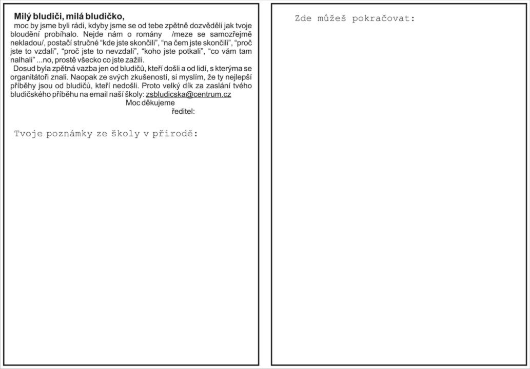 | Se žákovskou trochu souvisí i leták vyzívající k napsání bludičského příběhu, zážitku. Nejsem si jist čí už to byl přesně nápad zkusit na bludičích vymámit jakousi zpětnou vazbu. Možná můj, protože když už někdo nějakej nápad nadhodil chtěl jsem, aby si ho také realizoval. A leták jsem pytlíkoval zase já. Patří mi to! Zřídit mejla na centrumu byla maličkost a vymyslet nějaký text, formát letáku byla taky otázka hodinky. Pak už jen žákovský a letáky vytisknout, letáky rozstříhat na A5 a strávit dva večery kompletací stovky žákovských a letáků.Musím říci, že to byla největší pakárna, kterou jsem si na sebe ušil. Sešívačkou spíchnout žákovský, do každý přicvaknout leták a do každýho letáku a žákovský dát štempla s podpisem ředitele. Nevěřili byste, měl sem z toho na ruce puchejř! A pak, že ouředničina není tvrdá práce! |