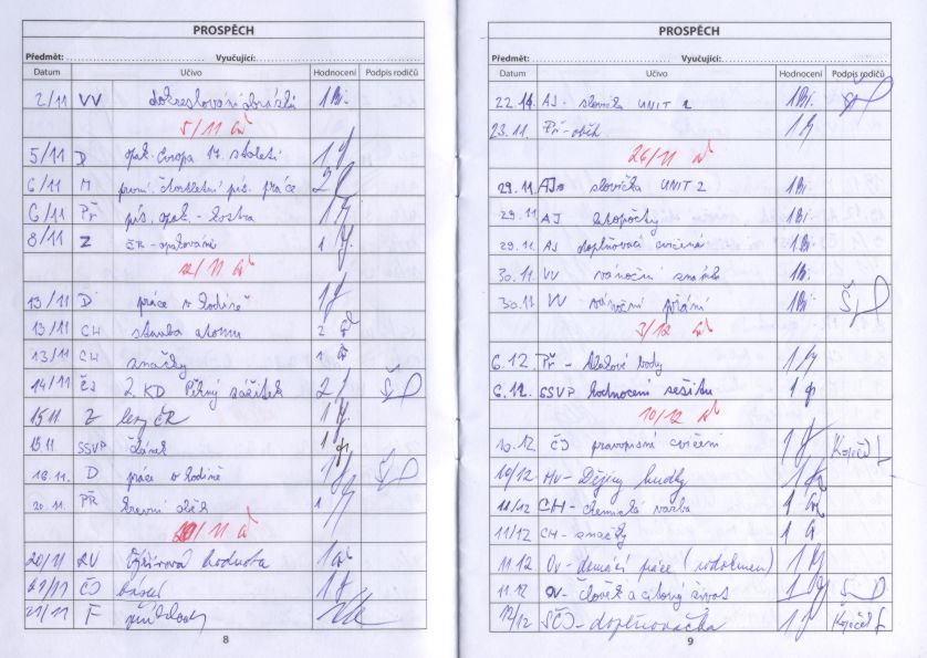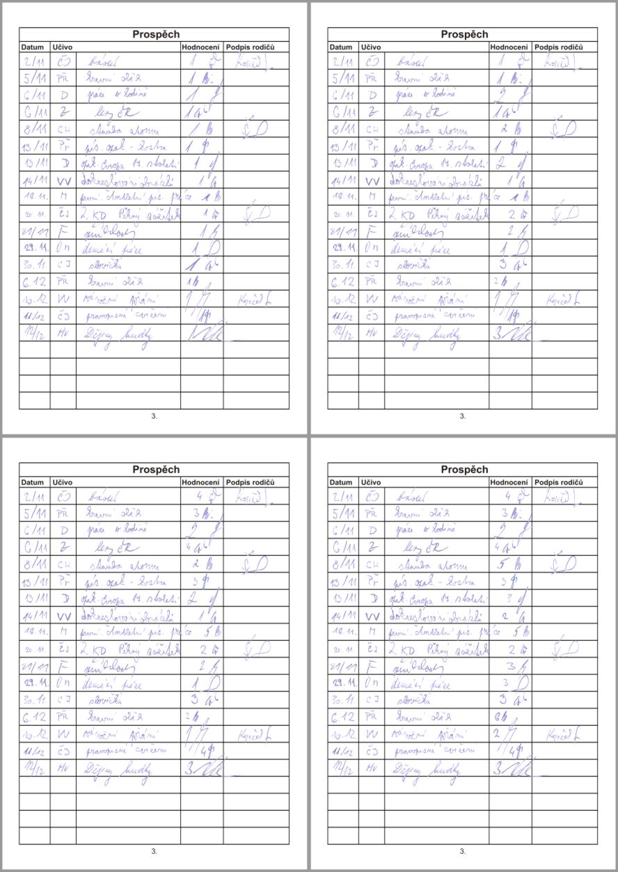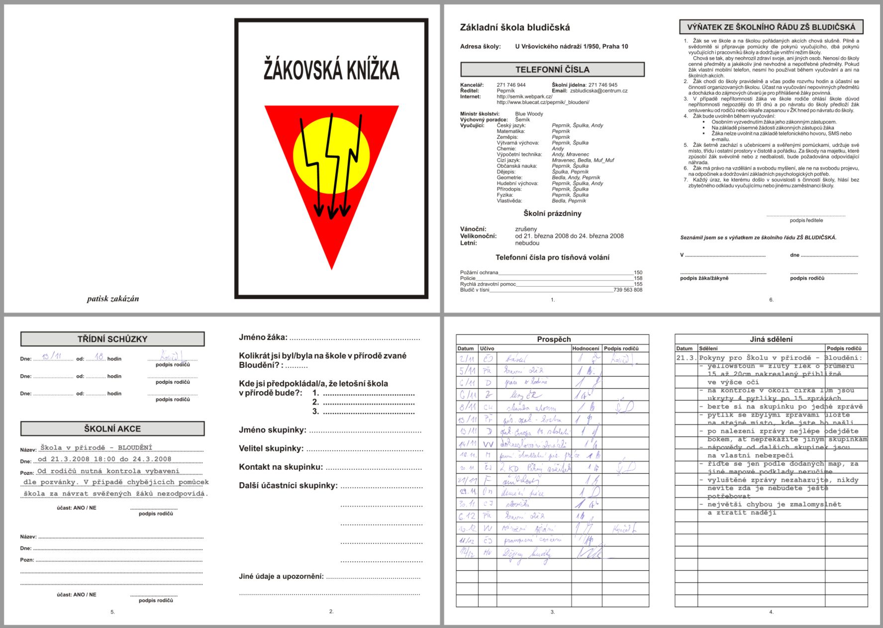| Žákovská vznikla doopravdy spíš pro srandu. S myšlenkou žákovský jsem si pohrával od začátku, ale nějaký solidní důvod proč ji udělat tu pořád nebyl. Snad jen jako informační plátek a malá památka pro bludiče. Tož jsem jednoho večera naskenoval Loupežníkovu žákovskou, aby se bylo od něčeho odpíchnout a začal cosi neurčitého bastlit. Však ono se to vytříbí a když už je něco v ruce i další nápady přijdou.Ze začátku bylo dilema co všechno do žákajdy uvést. Podle originálu nechat první stranu s informacema o škole, vyučujících. Druhá strana informace o bludiči - zde přišel hned nápad využít žákovskou k zapsání iniciálů bludičů, skupinky, místa předpokládaného bloudění, čísla na skupinku pro případ průseru, atd. Na poslední straně dle originálu byl výňatek ze školního řádu - ten se po úpravě dá taky použít.Ale co dál. Žákovská ve stylu přeložený papír A4 se mi moc nezamlouvala. Když to člověk drží v ruce, tak to prostě není žákovská. Ale když tam bude ještě jeden lupen přeložené A4, tak už to bude o něčem jiném. Zbývalo tedy vymyslet co plácnout na zbývající tři A5. Co by to bylo za žákovskou kdyby v ní nebyly známky, takže jedna A5 je zapláclá. Když jsem se koukl ještě do Loupežníkovej žákovský určitě půjde bílé místo zaplácnout informacema typu "Jiná sdělení", "Třídní schůzky", "Školní akce", atd.U všech stránek jsem dle počátečních myšlenek vyrobil koncept a s nápadama od Špulky doladil do finální podoby. Jen se stránkou známek byl trochu problém. Nechat jen oskenovanou bitmapu z Loupežníkovej žákajdy nevypadalo ohledně ostatních stránek dobře a nenapadlo mne nic lepšího než texty z bitmapy pracně vyřezat a posadit do nové čisté stránky se známkama.V tento moment mne přepadla další praštěná myšlenka proč těch verzí známek neudělat více. Když už jsem si s tím tak hrál, proč ne. Ostatně bavil jsem se při tom představou jak jsou někteří bludiči navýsost spokojený, že maj samý jedničky, který tě nikdá neměli a jiní ...tam maj i šestku. No, ta šestka byla taková blbůstka, jestli si toho někdo vůbec všimne a vznikla také náhodou. Jelikož Loupežník v žákajdě neměl nic horšího než dvojku musel jsem čísla horších známek vypreparovat z datumů, kde jsou i vyšší čísla než pět, tak jsem tam prostě tu šestku jen tak šoupnul. Na srazu a následně ve vlaku jsem byl rád, že se toto moje očekávání vyplnilo a lidi se bavili hláškama "však já jsem byl vždycky premiant", "já jsem dostala v přírodopisu z krevního oběhu šestku", atd.To pak člověk zahřeje a nelituje práce ani času, kterou nad tím dobrovolně strávil. |