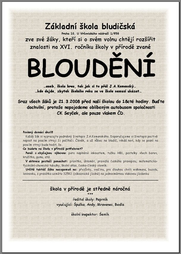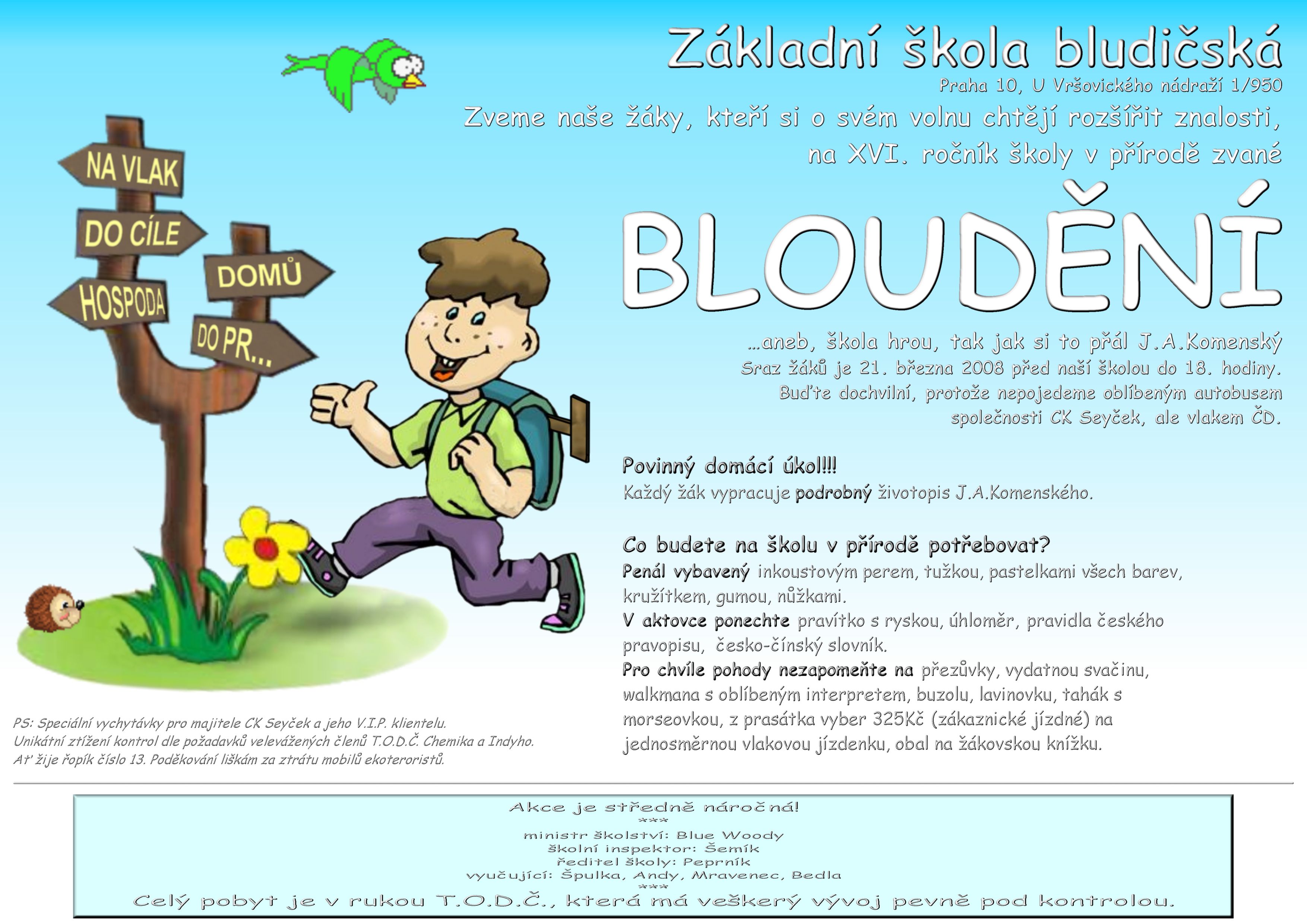 V tejto situaci mne nenechala Špulka, která dosud fungovala jako šedá eminence, poradce, studnice nápadů, hledač na webu a trpělivej člen rodiny, protože hlava rodiny už několik měsíců má z příprav Bloudění hlavu v pejru.Špulka, která pro Bloudění dosud udělala stokrát víc než ostatní organizátoři, se teď jala šmrdlat zvadlo v podobě školního časopisu. Ale i tak o uskutečnění časopisu jsem si přestával dělat iluzi. V průběhu vleklého řešení zvadla se mi začala čím dál více a reálněji vnukat myšlenka na vytvoření jednoduššího zvadla ve formě pozvánky na školní výlet či školy v přírodě. Šemík proti nebyl, ale proti byla Špulka, která měla rozdělaný školní časopis. V tom čase polovičce ledna se z Istanbulu vrátil Andy s Bedlou. Do termínu odevzdání zvadla zbývalo pět dní a Špulčino zvadlo bylo hotovo tak z jedné třetiny. Andy se tenkrát silácky ozval „že si bere zvadlo na své bedra“. Čubrněl jsem a nechápal. Buďto Andy v Istanbulu chytl nějakej bacil nebo ho tím siláckým sebevědomím nakazil Bedla.