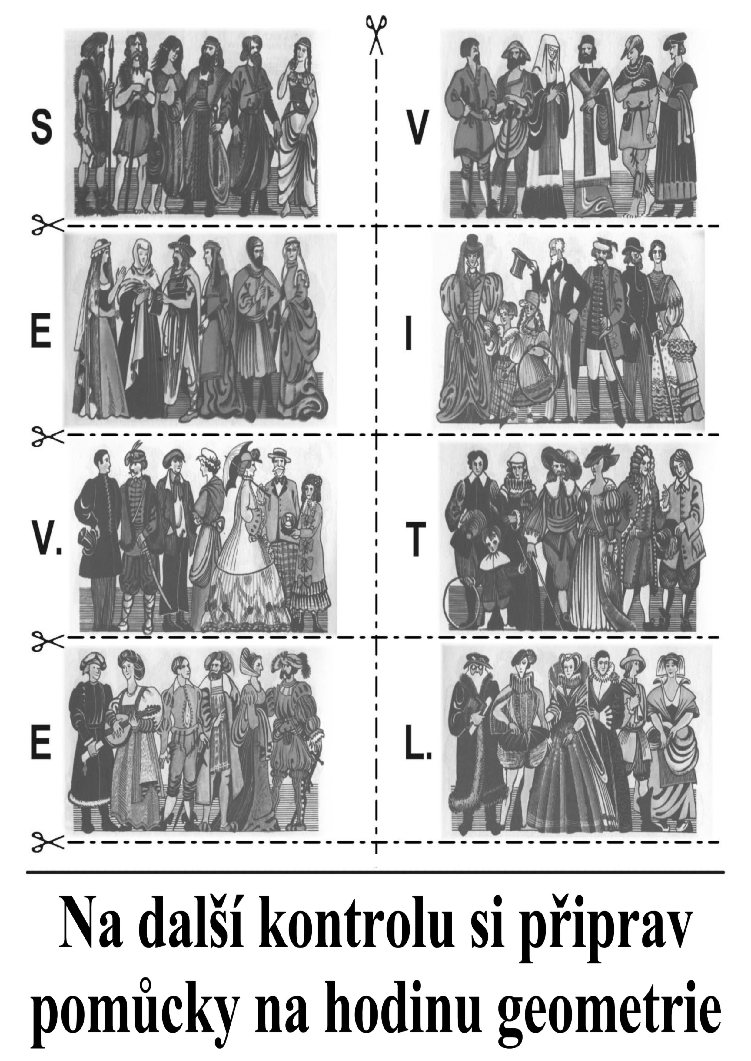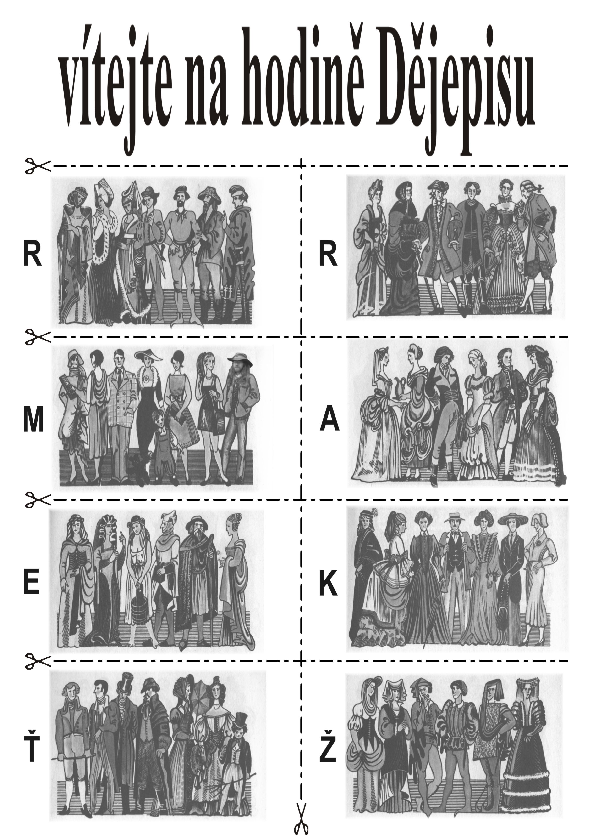 | Princip je opět jasný. Nůžkama rozstříhat papíry na jednotlivé obrázky a seřadit obrázky podle historické posloupnosti. |