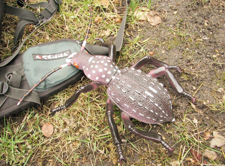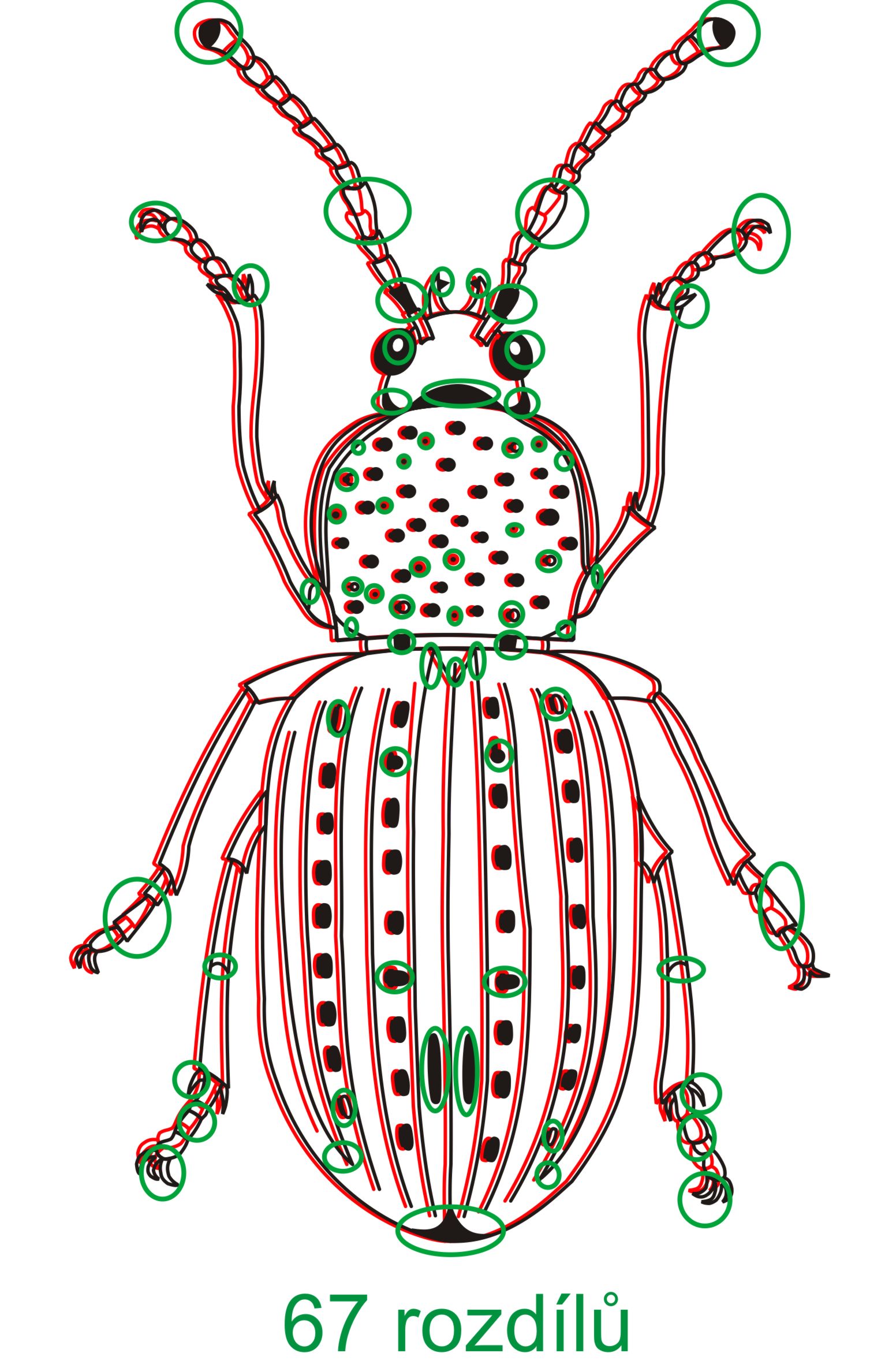 První grafický nápad byl udělat brouka nakreslenýho na nějakej starej listině vůči který by se nový brouk musel porovnat. Ale prvním výsledek vzhledem ke zoufalé kvalitě obrázku byl na prd. Obrázek byl jedno velké dilema co je a není rozdíl a to by nám bludiči omlátili o hlavu. Bylo mi jasné, že musím udělat úplně nového brouka, kde jeho obrysy budou jasně dané. Podle bitmapy hafokrát zvětšenýho brouka jsem v koreldráw začal vytvářet brouka vektorovýho. Překreslování článků nožiček a tykadel byla nekonečná pakárna. Celý překreslování mne vyšlo na více než dvacet hodin manuální práce u počítače. Ale bylo to potřeba, aby jsme se vyhnuli dohadům o nejasnosti rozdílů v obrázku. Když byl brouk hotov udělal jsem si druhou kopii, kde jsem pak začal bastlit rozdíly. Po hodině bastlení jsem se zastavil. No, kolik jsem těch změn jsem tam vlastně udělal? Za deset minut jsem napočítal 67 rozdílů. Možná to je zbytečně moc, ale při počítání symetrických rozdílů výsledná cifra naskakuje rychle. Jediná pakárna jsou puntíci na hřbetě, ale ty jsou dostatečně od sebe, takže dilema, že by byl rozdíl v posunu puntíku nastat nemůže. Jen jsem se trochu bál, aby někdo několik rozdílů v ose brouka nepočítal za dva.
