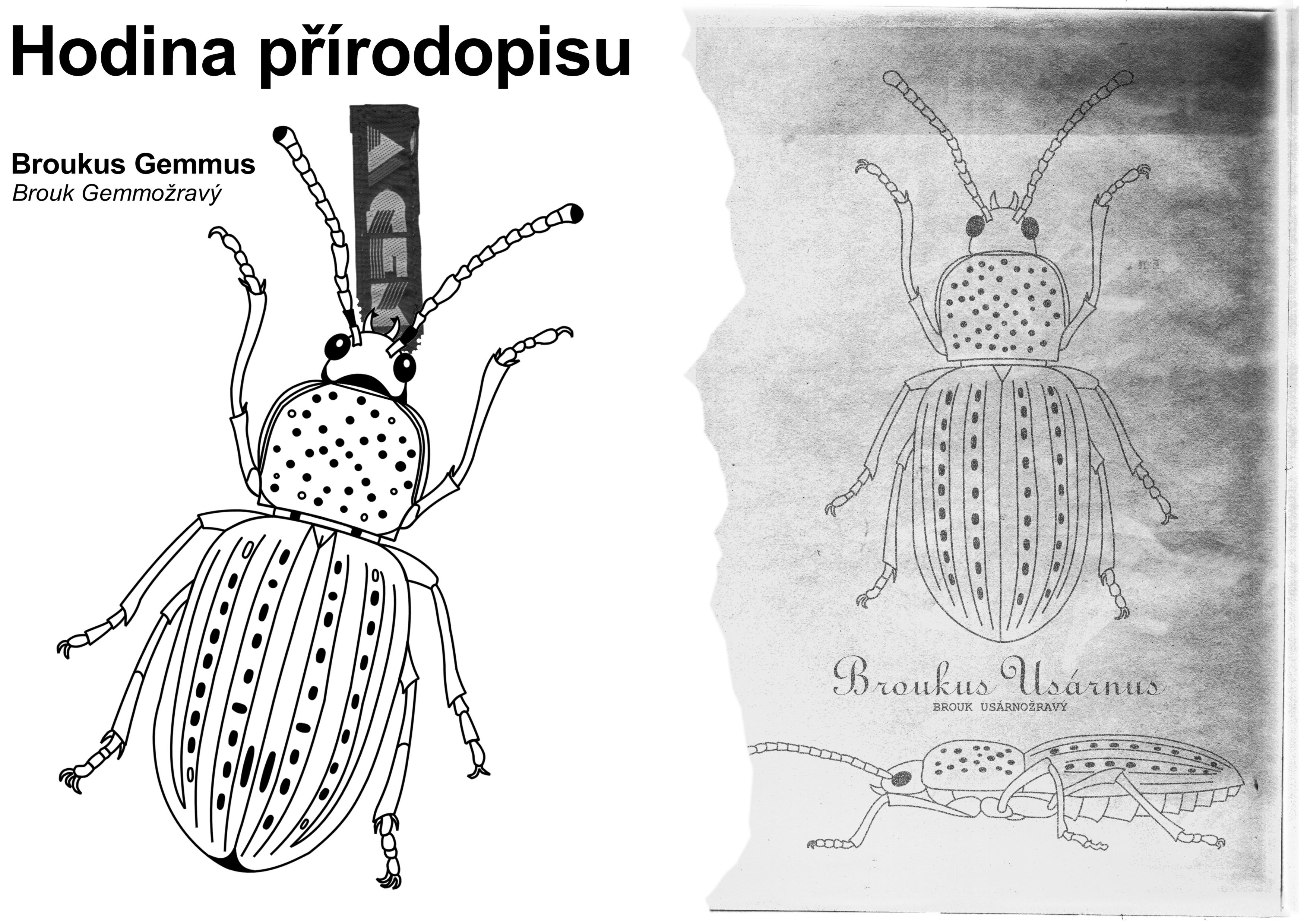 Brouk gemožrout do čelistí dostal k papáníčku nášivku s logem GEMMA, kterou jsem Loupežníkovi předtím odpáral z baťohu. Brouk usárnožravý dostal jako podklad urvaný kus papíru, aby vypadal trochu archivně. Na zadní straně jsem naklepal příběh o broukách, aby to nebylo tak suchopárný. Hotovo. Paráda.