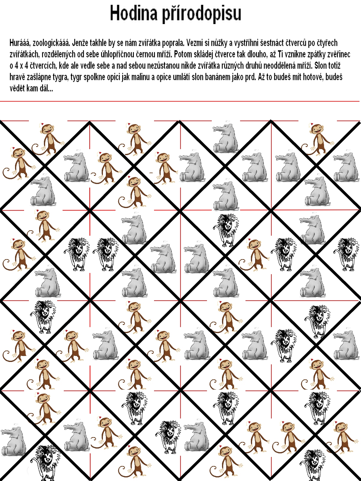 První reakce přišla až od Bedlu v polovičce února, kdy přeaktivně začal bloudění řešit. Přišel se šifrou zvířátek. Super, sic jsem zaskřípal nad prosazovanejma pohlavníma orgánama a nad několika hodinama rozdělaný práce skrz námět pohlavních orgánů. Jsou tam zvířátka, zoologická zahrada Dvůr Králové jako matoucí člen je hned v údolí. Ještě než jsem utekl z práce jsem si šifru vytiskl, rozstříhal na čtverečky a šel si udělat siestičku na záchod. Na první pohled se to zdálo strašně jednoduchý, ale po půl hodině jsem to zabalil a poslal Bedlovi otázku zda je možno, aby se čtverečky mohli otáčet či nikoliv. Ted den jsem už odpověď nedostal, ale další luštění jsem si vzal domů. Doma už Špulka vehementně luštila, ale bez úspěchu sestavit kartičky bez otáčení. Ale varianty s otáčením už měla dvě a to jiné než jsem měl já. Asi hodinu jsem ještě zkoušel sestavit variantu bez otáčení, bezúspěšně. Druhej den ráno mi Bedla odpověděl na otázku zda otáčet či neotáčet: „nevím, jsem to luštit ještě nezkoušel“. Můj skřípot zubů musel být slyšet i mimo Budějice. Že Bedla od začátku na Bloudění dlabal a poslední tejden jeho hyperaktivity jsem mu musel vysvětlovat situaci, protože skrz mumraj mejlů o bloudění se sám nechtěl probít, to jsem ještě skousnul. Ale toto už byla poslední kapka a bral jsem to od Bedlu vysloveně jako výsměch jeho totální nezodpovědnosti!!! Litoval jsem, že Bedla vůbec začal být aktivní. Držel jsem se, ale na uzdě, protože jsem nechtěl zadávat žádnou příčinu k nasranosti a ventilování informací mimo organizátory.