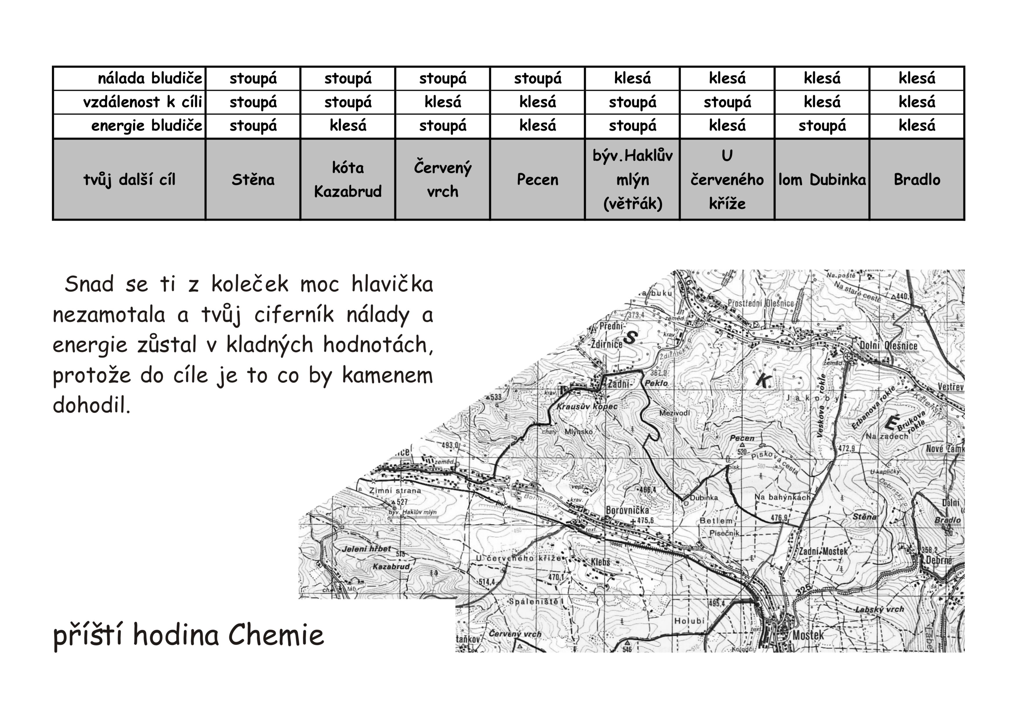 | A co ukáží ručičky budíků? Nálada na budíku klesá, únava klesá, vzdálenost k cíli stoupá (vše podle pravdy - i vzdušná vzdálenost k cíli se bude cestou k poslední kontrole zvětšovat). Takže další kontrola je na "U červeného kříže", kde stála bývalá ves Vidovice zaniklá za švédských válek. |