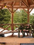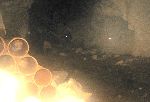 Kousek za železnejma dveřma chodba s výztuží končila a otevřel se prostor, celkem velká kaverna se spoustou odboček. Prohlížíme jakési laserové zaměřovací přístroje, které stopro souvisí s desítkami odrazek v chodbách. Voda tu teče všude, však to prej má být dědičná štola, takže nemá cenu se ženírovat, abych si nenabral do bot. Kluci šli dírami XY, tak prozkoumám vedlejší díru YX vedle. Končím u podezřelýho žebřu hore a zatopenej šachtě dole. Vracím se a pak o díru blíž kde byly odbočky se zřícenou dřevěnou výdřevou, tam by snad jeloustouna nedali. Z iksté odbočky se vracím do hlavní kaverny a konečně potkávám kluky, prej stouna taky ještě nenašli. Je to divný, odhadujem že stoun bude nejspíš na těch železných vratech zezedu a bez přemýšlení prcháme do dalších ďur ......a až cestou zpět, na těch železnejch vratech samozřejmě stoun nebyl, nám volům docvakává, že žluté kolo stounu svítí nad vchodem štoly, takže zpráva bude tam!!! No, stejně by jsme si sem do štoly neodpustili nevlízt :-)