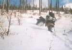 Pauza u rozcestí a pes ve skoku chytající sněhovou koulu