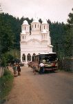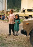 Čekání na bus před kostelem v Girda de Sus, žebrající dítka