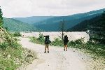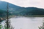 Přehrada Oasa Mica z hráze, v pozadí Virfu lui Patru