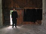 Pepr oblékající se do hábitu, aby šel vyfotit minutou kopuli kostela