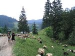 Ráno, tedy odpoledne s bačou ženoucí stádo přes sedlo Curmâtura Tihului