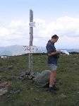 Rozcestník v sedle Curmâtura Tihului podpíraný kolejnicema z úzkokolejky