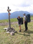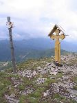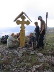 Kříž a cedulovník na vrcholu Pietrosulu nejvyšší hory Calimanu 2100m vysokém
