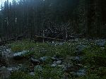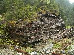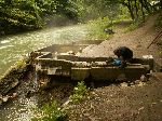 Prší a narazili jsme na ňákej zbytek stavby - rošty z klád proložený kamenama. Bejt to na kopci, tak si pod tímto představím hradištní opevnění. Tady to spíš představovalo hráz, ale na druhé straně říčky žádné další zbytky nejsou ...no, třebas to nedostavěli.