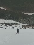 Andy se rozjel dolů. Už jsme pod mlhou. Sice tenhle sjezd považuju za nebezpečnej, ale mokrej čerstvej sníh lepí a brzdí, takže sjezd jde řídit.