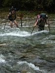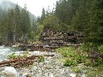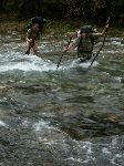 Kus za tou hrází jsme na druhé straně říčky uviděli ve stráni něco jako cestu. A jelikož už jsme měli dost prodírání se houštinama za deště padlo rozhodnutí se na tu cestu dostat. Potok už byl půlmetrovej a s velkým proudem, takže jsme se nakonec vraceli a vraceli proti proudu, kde by to šlo nejsnáze přebrodit. A i tak to v ledové vodě nebyla žádná sranda.