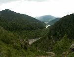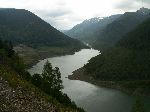 Výhledy na vody přehrady. V pozadí už jsou hory Retezatu