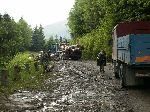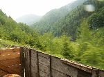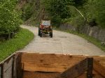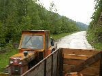 Prvně jsme stopli traktor s valníkem plný rumunů. Po půl kilometru přesedáme na korbu náklaďáku.