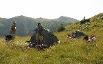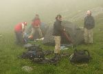 Poledne u ples v kotli pod Vf. Şerbota. Po necelých dvou dnech přestalo aspoň pršet tudíž rozhejbat proleženiny, sbalit se a hurá zpátky na hřeben.
