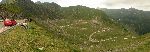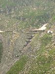 Údolí se silnicí stoupající k hrázi přehrady Vidraru