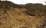 Kolejka tu měla vést údolím do sedla a pak se defakto obrátit o stoosmdesát stupňů a ve svahu stoupat k tunelu na ostrožně, který by teď měl být nad námi. Ale tento sargofág nás dostal. Prostě rumunsko nepřestane překvapovat:-) Celkem velký potok uvězněný v betonovém tunelu a nad ním, kde měla vést úzkokolejka jedna dlouhá obrovská výsypka. Z počátku jsme ani nevěřili, že se o výsypku jedná, spíš že se jedná o nějaký přírodní útvar.