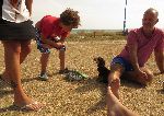 ...ale ve stavbě pevnosti se pokračuje dál. Jenže sem tam nějaká vlna dosahuje až písčitým hradbám, tak se se jal klukům pomoci a z pláže donosil nějaké větší šutry ...základ valu holt musí bejt z něčeho odolnějšího.